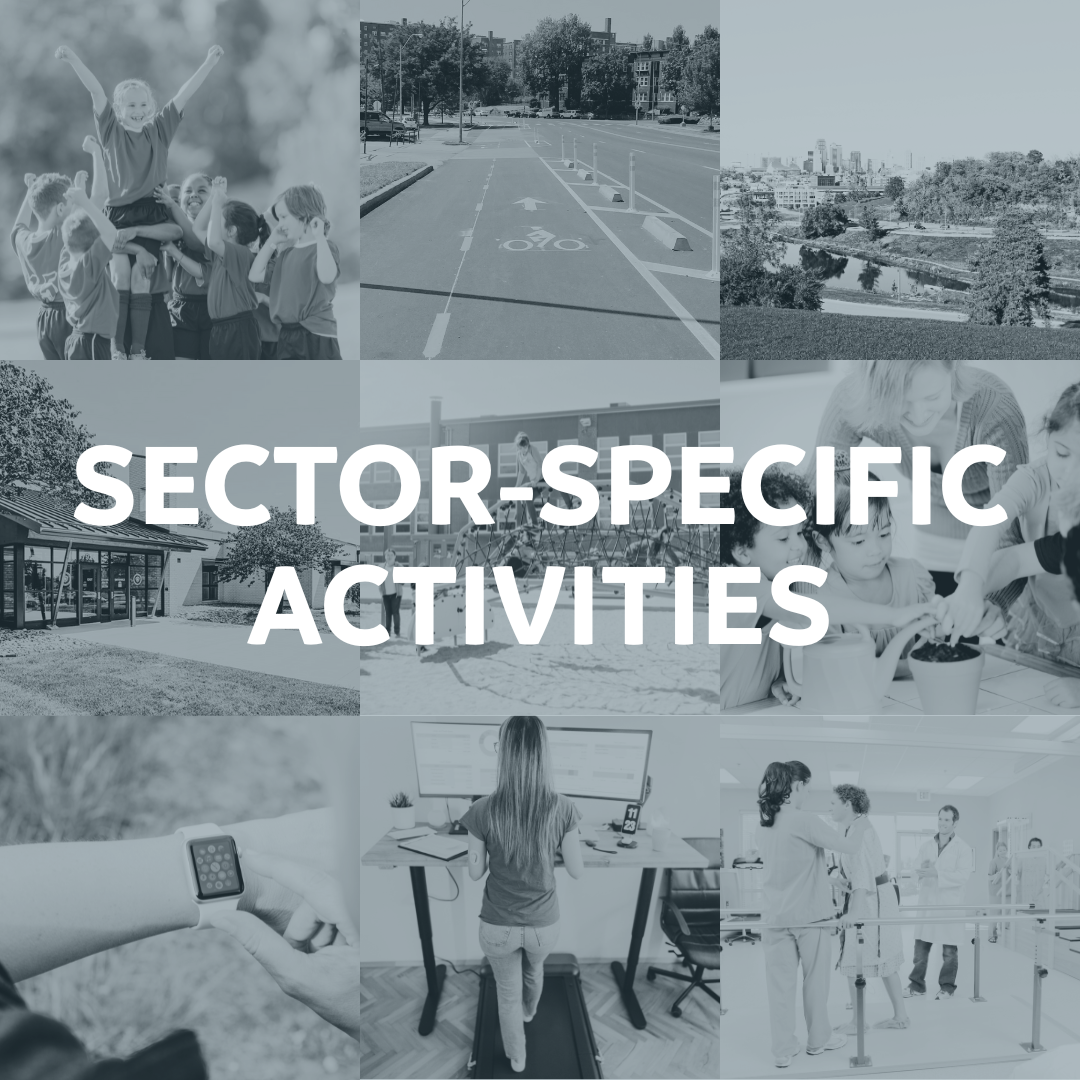 Highlights physical activity across key societal sectors. A societal sector encompasses a wide-ranging area where strategic efforts can be coordinated to encourage physical activity. These sectors reflect the diverse environments and systems that shape individuals' daily lives and behaviors.